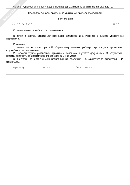 Распоряжение о проведении служебного расследования в связи с фактом утраты личного дела работника (рекомендуемый образец заполнения)
