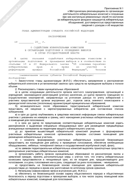 Распоряжение о содействии избирательным комиссиям в организации подготовки и проведения выборов в орган государственной власти (рекомендуемый образец заполнения)
