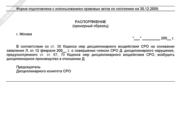 Распоряжение о возбуждении дисциплинарного производства в отношении лица, совершившего дисциплинарное нарушение (рекомендуемый образец заполнения)