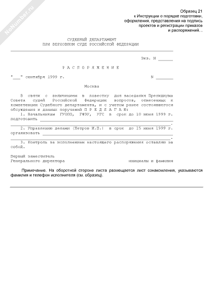Распоряжение первого заместителя генерального директора (рекомендуемый образец заполнения)