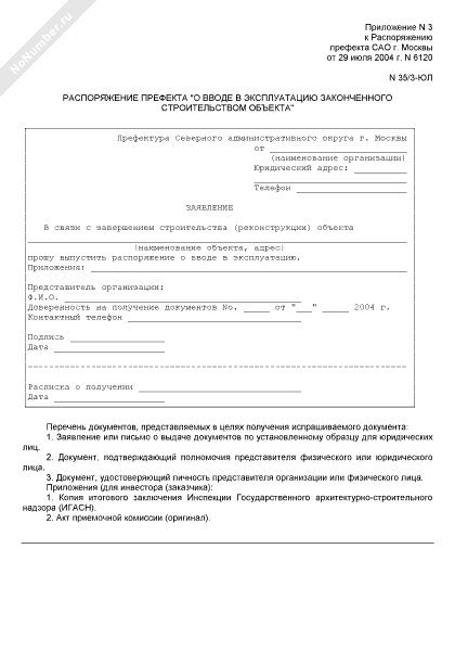 Распоряжение префекта «О вводе в эксплуатацию законченного строительством объекта» (рекомендуемый образец заполнения)