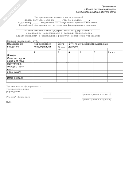 Распределение доходов от приносящей доход деятельности на год по разделу, подразделу, бюджетной классификации доходов бюджетов Российской Федерации по источникам формирования доходов (приложение к смете доходов и расходов по приносящей доход деятельности на год федерального государственного учреждения, находящегося в ведении Министерства здравоохранения и социального развития Российской Федерации)