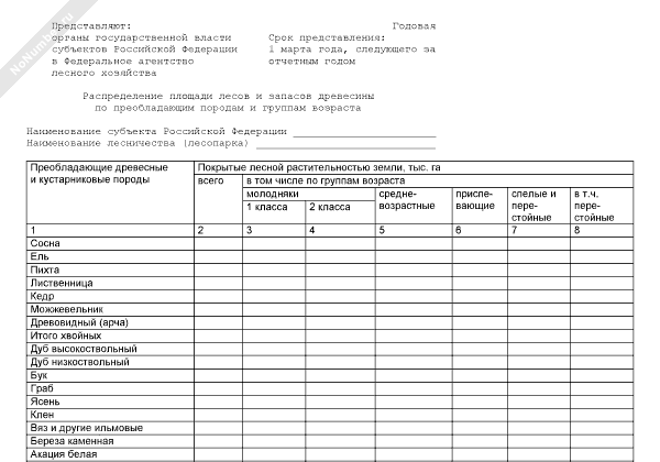 Распределение площади лесов и запасов древесины по преобладающим породам и группам возраста (информация для представления в Федеральное агентство лесного хозяйства, занесенная в государственный лесной реестр)