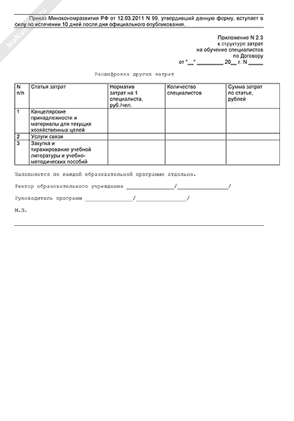 Расшифровка других затрат (приложение к структуре затрат на обучение по договору)