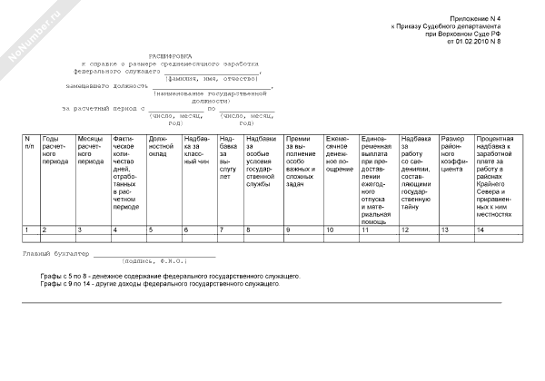 Расшифровка к справке о размере среднемесячного заработка федерального служащего системы Судебного департамента при Верховном Суде Российской Федерации и судов общей юрисдикции, замещавшего должность за расчетный период (рекомендуемый образец заполнения)