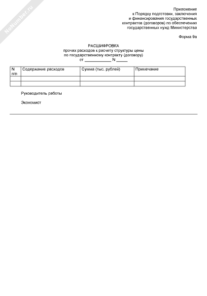 Расшифровка прочих расходов к расчету структуры цены по государственному контракту (договору) по обеспечению государственных нужд Минобрнауки РФ. Форма № 9А