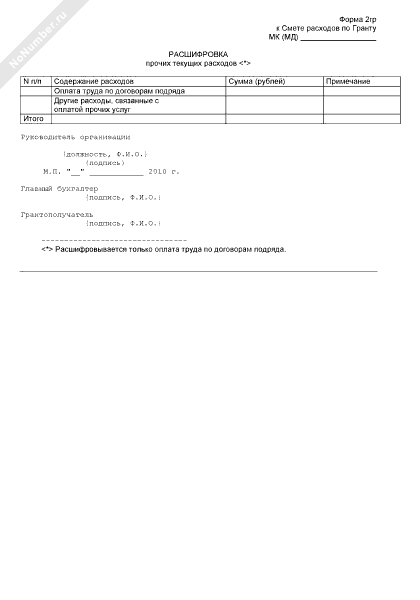 Расшифровка прочих текущих расходов. Форма № 2гр (приложение к дополнительному соглашению к договору об условиях использования гранта Президента Российской Федерации для государственной поддержки молодых российских ученых)