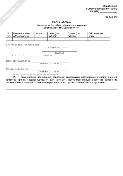 Расшифровка расходов на спецоборудование для научных (экспериментальных) работ (приложение к смете расходов по гранту к дополнительному соглашению к договору об условиях реализации гранта Президента Российской Федерации для поддержки молодых российских ученых). Форма № 3ГР