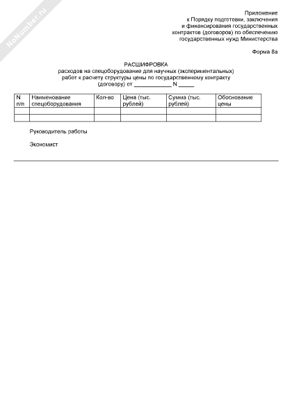 Расшифровка расходов на спецоборудование для научных (экспериментальных) работ к расчету структуры цены по государственному контракту (договору) по обеспечению государственных нужд Минобрнауки РФ. Форма № 8А