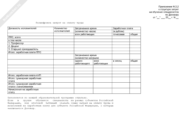Расшифровка затрат на оплату труда (приложение к структуре затрат на обучение по договору)