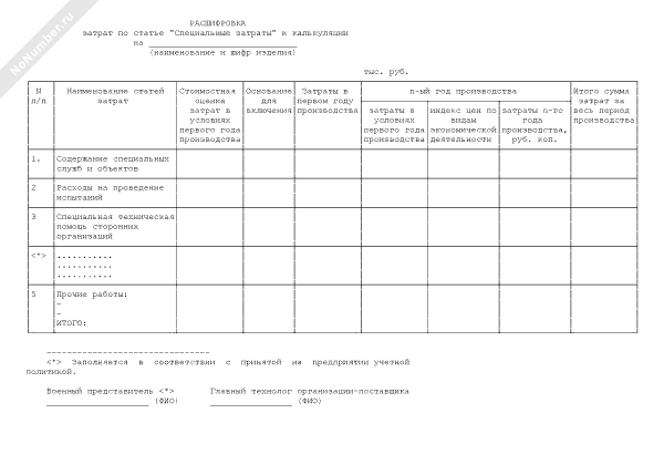 Расшифровка затрат по статье «Специальные затраты» к калькуляции (для продукции с длительным технологическим циклом производства)