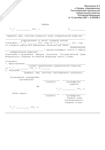 - 198Заверенная копия приказа об освобождении от основной работы для выполнения обязанностей члена избирательной комиссии с правом решающего голоса в период подготовки и проведения выборов депутатов Государственной Думы Федерального Собрания Российской Федерации пятого созыва