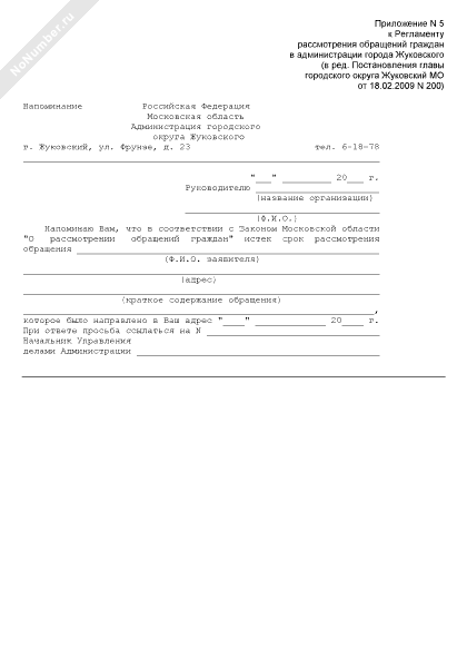 - 433Напоминание об истечении срока рассмотрения обращения гражданина в администрацию города Жуковского Московской области