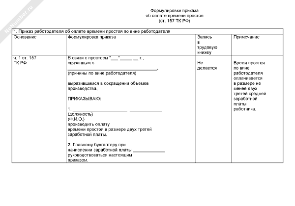 - 781Примерные формулировки записей в приказе и трудовой книжке об оплате времени простоя (ст. 157 ТК РФ)