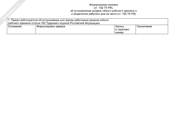 - 782Примерные формулировки записей в приказе и трудовой книжке об установлении режима гибкого рабочего времени (ст. 102 ТК РФ), разделении рабочего дня на части (ст. 105 ТК РФ)