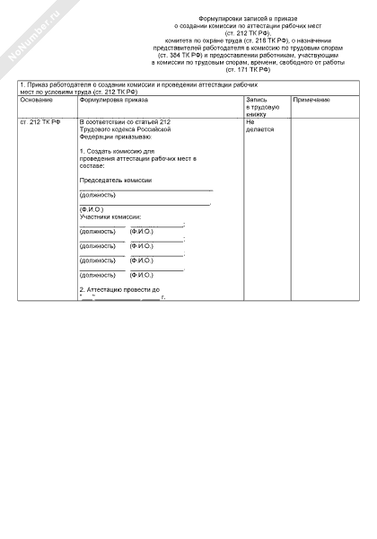 - 784Примерные формулировки записей в приказе и трудовой книжке о создании комиссии по аттестации рабочих мест (ст. 212 ТК РФ), комитета по охране труда (ст. 218 ТК РФ), о назначении представителей работодателя в комиссию по трудовым спорам (ст. 384 ТК РФ) и предоставлении работникам, участвующим в комиссии по трудовым спорам, времени, свободного от работы (ст. 171 ТК РФ)