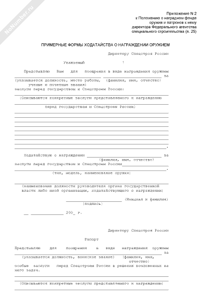 - 787Примерные формы ходатайств о награждении оружием военнослужащих и гражданского персонала Спецстроя России за заслуги перед государством, воинские подвиги, воинскую доблесть, разумную инициативу, усердие и отличие по службе