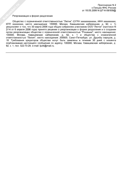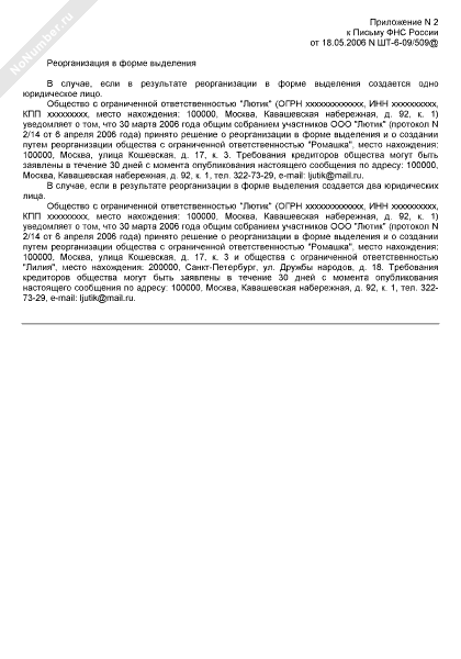 - 796Примеры текстов публикации сообщений о принятом решении о реорганизации юридического лица в журнале «Вестник государственной регистрации» (реорганизация в форме разделения)