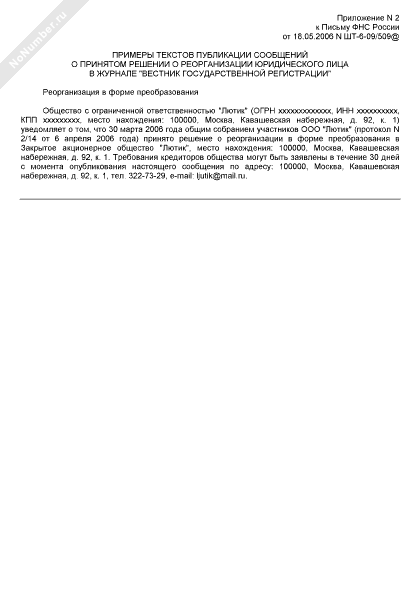 - 795Примеры текстов публикации сообщений о принятом решении о реорганизации юридического лица в журнале «Вестник государственной регистрации» (реорганизация в форме преобразования)
