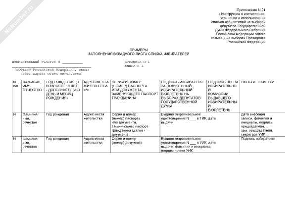 - 791Примеры заполнения вкладного листа списка избирателей на выборах депутатов Государственной Думы Федерального Собрания Российской Федерации пятого созыва и на выборах Президента Российской Федерации