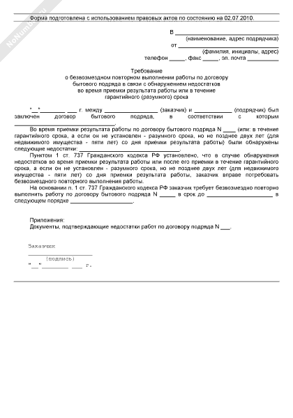 - 1220Требование заказчика о безвозмездном устранении подрядчиком за пределами установленного срока существенных недостатков результата работы по договору бытового подряда, возникших до принятия результата работы заказчиком или по причинам, возникшим до этого момента