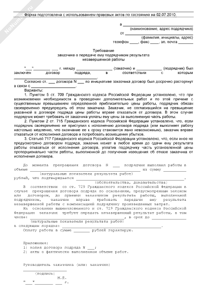 - 1211Требование заказчика о передаче ему подрядчиком результата незавершенной работы
