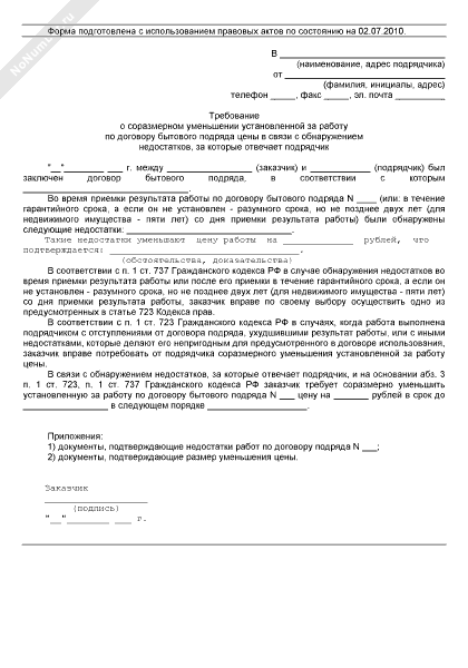 - 1214Требование заказчика о соразмерном уменьшении установленной за работу по договору бытового подряда цены в связи с обнаружением недостатков, за которые отвечает подрядчик