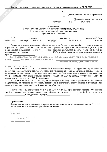 - 1216Требование заказчика о возмещении подрядчиком, выполнившим работу по договору бытового подряда заново, убытков, причиненных просрочкой исполнения