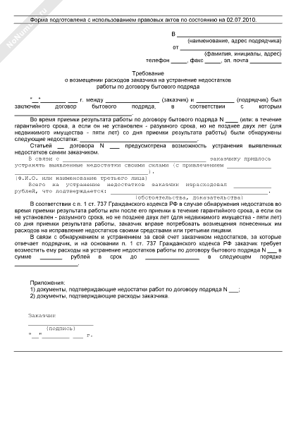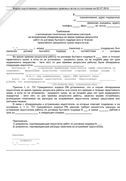 - 1219Требование заказчика о возмещении подрядчиком расходов, понесенных заказчиком на исправление обнаруженных во время приемки результата работ по договору бытового подряда или в течение гарантийного (разумного) срока недостатков