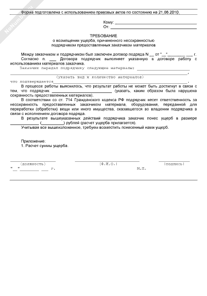 - 1202Требование заказчика о возмещении ущерба, причиненного несохранностью подрядчиком предоставленных заказчиком материалов