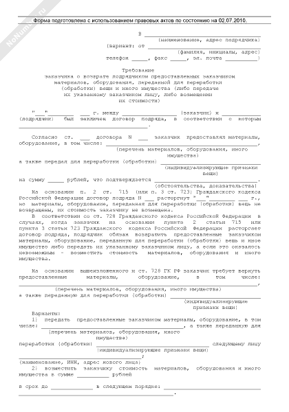 - 1210Требование заказчика о возврате подрядчиком предоставленных заказчиком материалов, оборудования, переданной для переработки (обработки) вещи и иного имущества, либо передаче их указанному заказчиком лицу, либо возмещении их стоимости