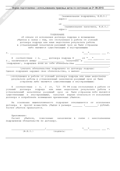 - 1203Требование заказчика об отказе от исполнения договора подряда и возмещении убытков в связи с тем, что подрядчик не приступает своевременно к исполнению договора подряда или выполняет работу настолько медленно, что окончание ее к сроку становится явно невозможным