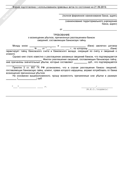- 1242Требование клиента о возмещении убытков, причиненных разглашением банком сведений, составляющих банковскую тайну