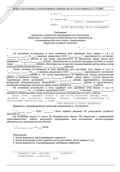 - 1247Требование кредитора о досрочном прекращении или исполнении обществом с ограниченной ответственностью обязательств и возмещении убытков в связи с уменьшением обществом уставного капитала