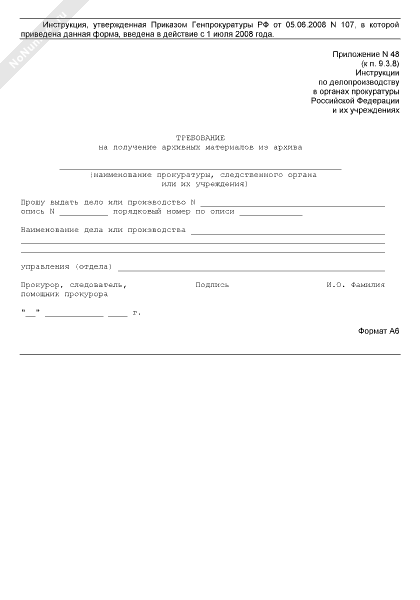 - 1257Требование на получение архивных материалов из архива прокуратуры, следственного органа или их учреждения