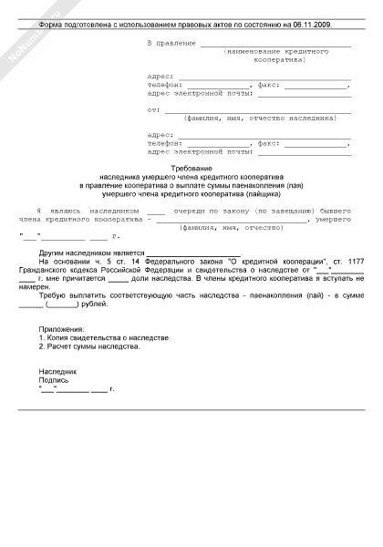 - 1259Требование наследника умершего члена кредитного кооператива в правление кооператива о выплате суммы паенакопления (пая) умершего члена кредитного кооператива (пайщика)