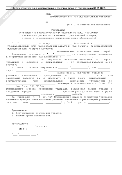 - 1411Требование поставщика к государственному (муниципальному) заказчику о компенсации расходов, связанных с реализацией товаров, в связи с невыполнением заказчиком своих обязанностей