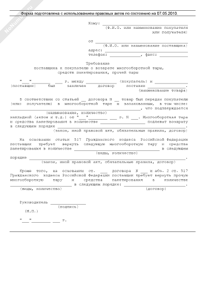 - 1406Требование поставщика к покупателю (получателю) о возврате многооборотной тары, средств пакетирования, прочей тары