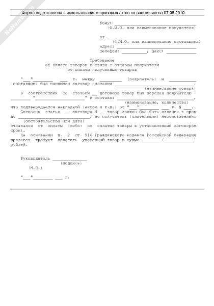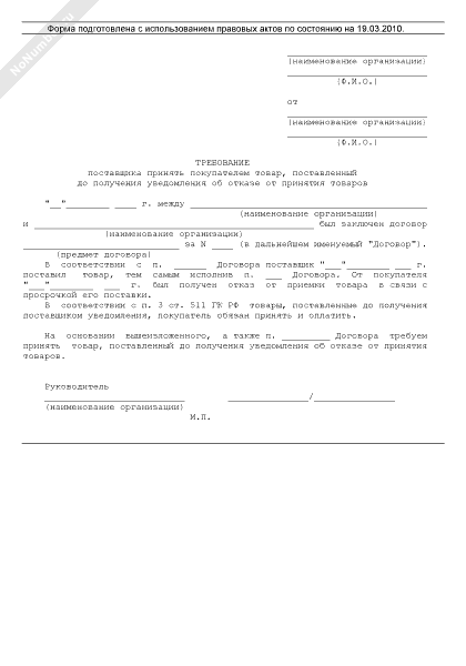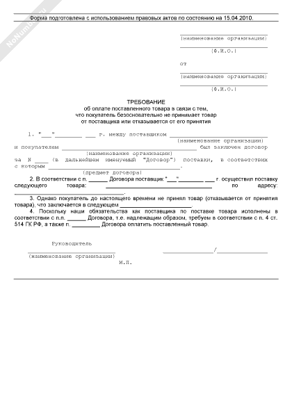 - 1401Требование поставщика об оплате поставленного товара в связи с тем, что покупатель безосновательно не принимает товар от поставщика или отказывается от его принятия