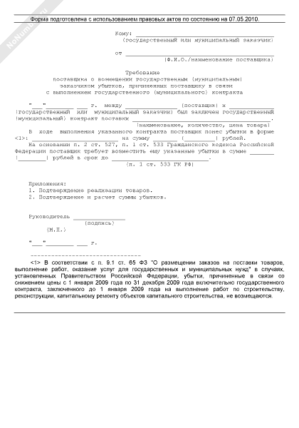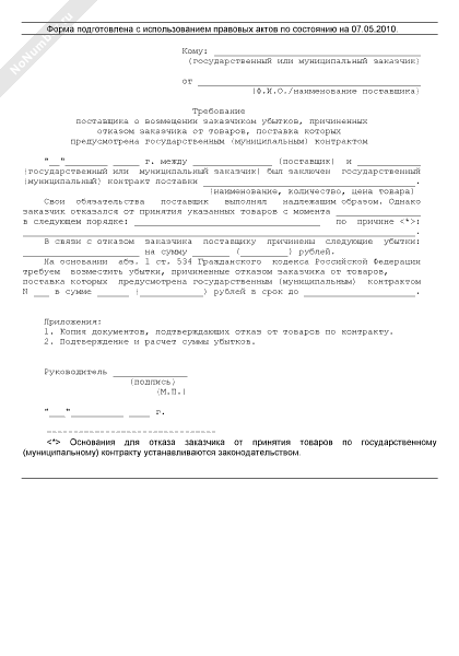 - 1407Требование поставщика о возмещении заказчиком убытков, причиненных отказом заказчика от товаров, поставка которых предусмотрена государственным (муниципальным) контрактом