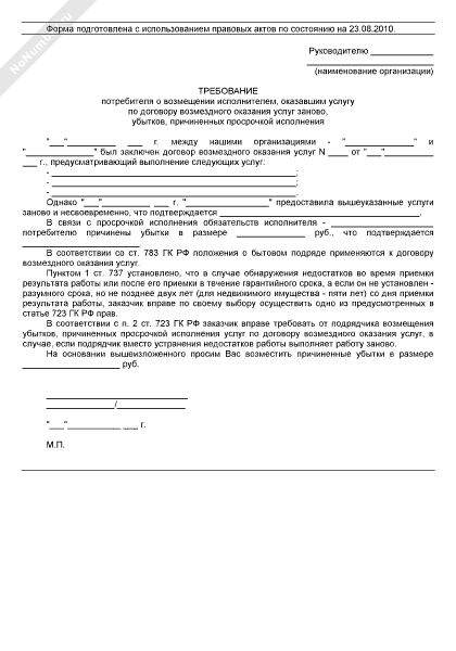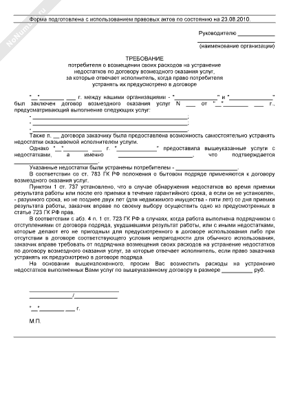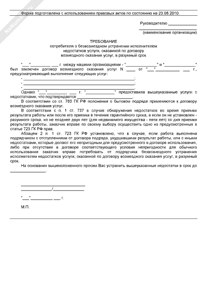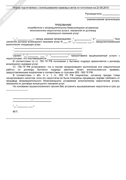 - 1419Требование потребителя о незамедлительном безвозмездном устранении исполнителем недостатков услуги, оказанной по договору возмездного оказания услуг