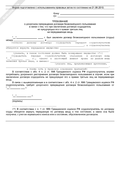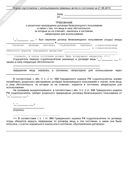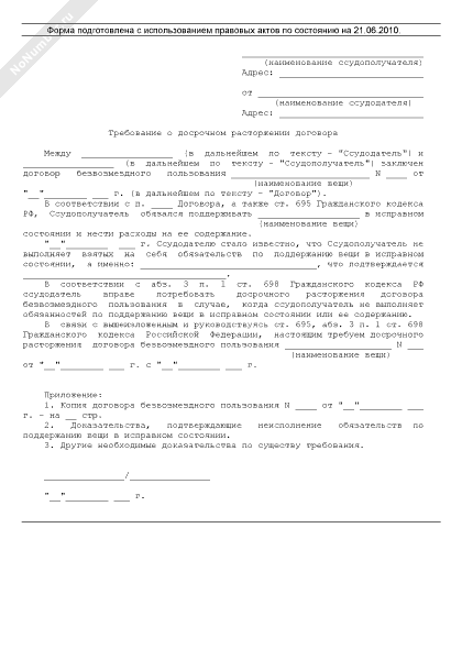 - 1441Требование ссудодателя о досрочном расторжении договора безвозмездного пользования в связи с тем, что ссудополучатель не выполняет обязанностей по поддержанию вещи в исправном состоянии или ее содержанию
