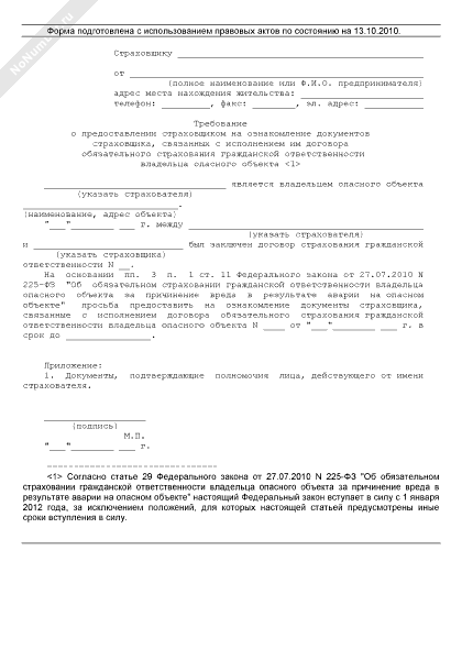 - 1451Требование страхователя о предоставлении страховщиком на ознакомление документов, связанных с исполнением договора обязательного страхования гражданской ответственности владельца опасного объекта