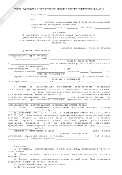 - 1450Требование страхователя об уменьшении размера страховой премии пропорционально уменьшению страхового риска по договору обязательного страхования гражданской ответственности владельца опасного объекта