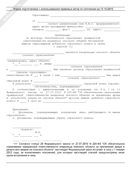 - 1453Требование страхователя по договору обязательного страхования гражданской ответственности владельца опасного объекта бесплатной выдачи страховщиком дубликата страхового полиса в связи с утратой