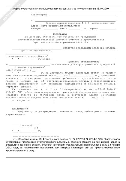 - 1452Требование страхователя по договору обязательного страхования гражданской ответственности владельца опасного объекта о предоставлении страховщиком копии страхового акта