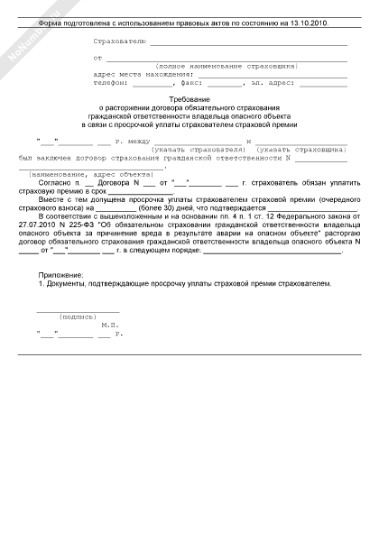 - 1456Требование страховщика о расторжении договора обязательного страхования гражданской ответственности владельца опасного объекта в связи с просрочкой уплаты страхователем страховой премии