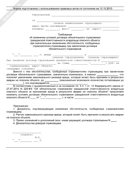 - 1454Требование страховщика об изменении условий договора обязательного страхования гражданской ответственности владельца опасного объекта при значительных изменениях обстоятельств, сообщенных страхователем страховщику при заключении договора обязательного страхования