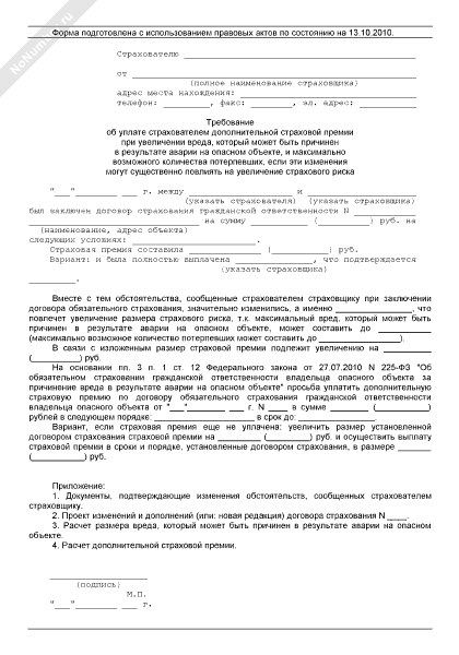 - 1455Требование страховщика об уплате страхователем дополнительной страховой премии при увеличении вреда, который может быть причинен в результате аварии на опасном объекте, и максимально возможного количества потерпевших, если эти изменения могут существенно повлиять на увеличение страхового риска