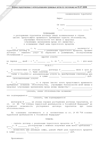 - 1460Требование туриста о расторжении турагентом договора ввиду возникновения в стране (месте) предстоящего временного пребывания туриста обстоятельств, угрожающих безопасности его жизни и здоровью (угрожающих причинением вреда его имуществу), и возмещении общей цены туристского продукта